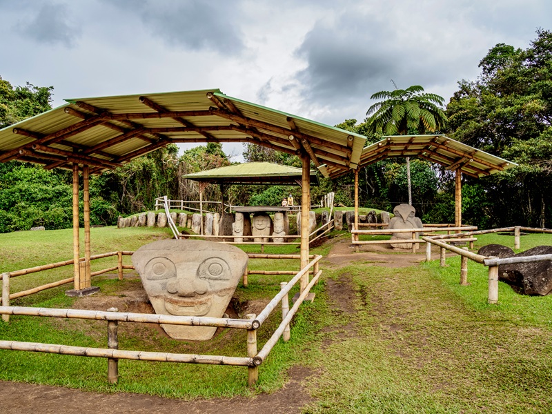 The route continues toward Tierradentro, a remarkable archaeological landscape in Latin America, where underground tombs and funerary galleries reveal the spiritual depth of the ancient cultures that once inhabited these mountains. Further south, San Agustín emerges as the archaeological heart of the nation, with monumental statues, ceremonial centers and landscapes shaped by the Colombian Massif.